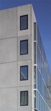 Im Hinblick auf die benachbarten neu konzipierten aus-drucksstarken Gebäude war es wichtig, auch dem ECR eine selbstbewusste Identität zu geben. Die Fassade sollte eine nachhaltige Ausstrahlung mit eigenem Charakter nach außen tragen, der das Gebäude fasst. Ein massiver Rahmen aus grauen Beton-Fertigteilen fasst die vorspringende Fassade ein. Die Fertigteile aus durchgefärbtem Beton mit Basaltnatursteinanteil erhielten mittels einer groben Matrize und nachfolgender Sandstrahlbehandlung ihre raue Optik. Dadurch wird auch nach außen eine gewisse Robustheit des Gebäudes transportiert und so ein Bezug zu der Geschichte