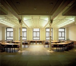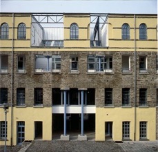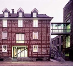 The Engelskirchen Town Hall. Had the architects not independently investigated possibles uses of the former factory buildings, a conventional housing development would have replaced this historic complex. After a long and complicated planning phase, the empty factory (built in the 19th century, partly destroyed in world war II, partly rebuilt in a simpler style and closed in 1978) was remodeled  as part of a civic center. In this case, the old structures were used as raw material for a new concept, requiring problematic, but ultimately approved, altera-