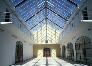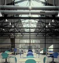 tronik genutzt, in dem durch die Verknüpfung mechanischer, optischer und elektronischer Teile im Miniaturformat tech-nische Lösungen für den industriellen Einsatz entwickelt werden, also Hard- und Software. Daneben wird ein Bil-dungsforum für den Bereich Managerservice und -training geboten. Der T-förmige Bau mit seiner zentralen marktähn-lichen Halle ist gut geeignet, da sich die Halle als Treffpunkt für all die unterschiedlichen Nutzergruppen anbietet.