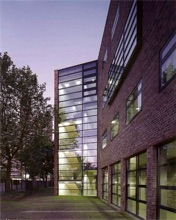 Durch das Hinzufügen von Baukörpern konnte die fehlende Straßenbebauung entlang der Universitätsstraße ergänzt werden. Der herausgeklappte Treppenraum, der sich zur Fahrbahn hin öffnet und der ausgedrehte Baukörper ergänzen nicht nur die Bauflucht, sondern bilden verschiedene Räume und interessante Blickbeziehungen, die auch vom fließenden Verkehr wahrgenommen werden. Hinter dem großflächigen Glaskern werden Flur-erweiterungen sichtbar, in denen die Schüler Gelegenheit haben sich zu orientieren und sich für eine kurze Weile aufzuhalten.