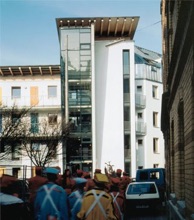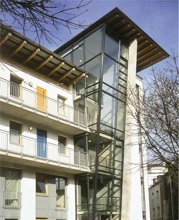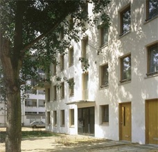 Puffer zwischen dem öffentlichen Platz und den privaten Wohnbereichen gedacht. Diese Idee ist im Prinzip richtig. Die Wohnungsgrundrisse sind gut geschnitten und richtig bemessen. Auf unspektakuläre Art bieten sie für die Ver-sorgung der sanierungsbetroffenen Mieter eine ausge-zeichnete Grundlage.